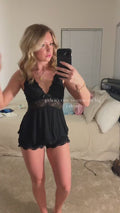 Lasciati conquistare dal morbido pizzo, dai volant svolazzanti e dalla scollatura a V che esalta le curve senza sforzo. Le spalline regolabili ti offrono la vestibilità perfetta: dolce, romantica e irresistibilmente femminile.