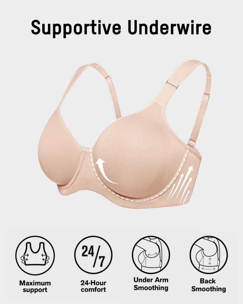 Say goodbye to visible bra lines or texture showing through clothes. This smooth minimizer bra features higher side wings to eliminate back and underarm bulges, giving a clean, polished silhouette from morning to night.